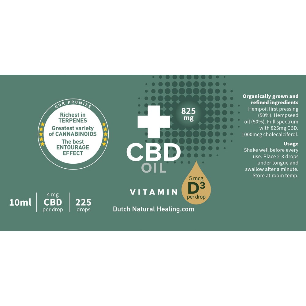 Das CBD-Öl 8% mit Vitamin D3 von Dutch Natural Healing basiert auf unserem bewährten wirksamen und 100% biologischen Hanfextrakt. Aufgrund der einzigartigen 1:1-Verdünnung unseres Hanfextrakts mit Hanfsamenöl enthält eine 10ml Flasche 825 mg CBD bester Qualität. Abgesehen davon ist es angereichert mit 1000mcg Vitamin D3, von dem ausgegangen wird, dass es ein gut funktionierendes Immunsystem unterstützt sowie gesunde Muskeln stimuliert. Darüber hinaus legen Studien nahe, dass sowohl CBD als auch Vitamin D3 eine wichtige Rolle bei der Behandlung und Prävention von COVID-19 spielen könnten.