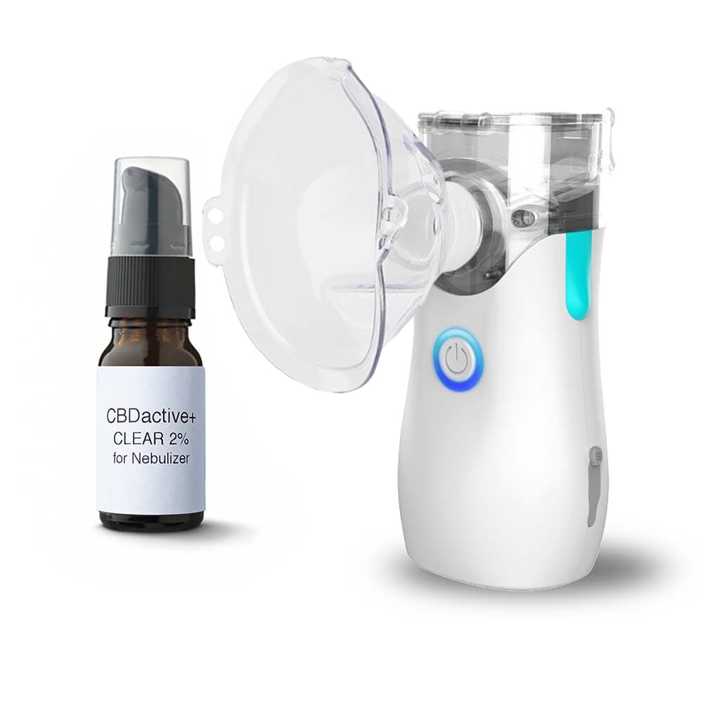 1 Pumpstoß CBDactive+ Clear mit 5 ml Kochsalzlösung mischen und in das Inhalationsgerät geben. Setze dann das Mundstück auf und inhaliere so lange bis es leer ist. Der Vernebler verwendet Ultraschallwellen, um die CBDactive+ Clear-Lösung zu vernebeln.